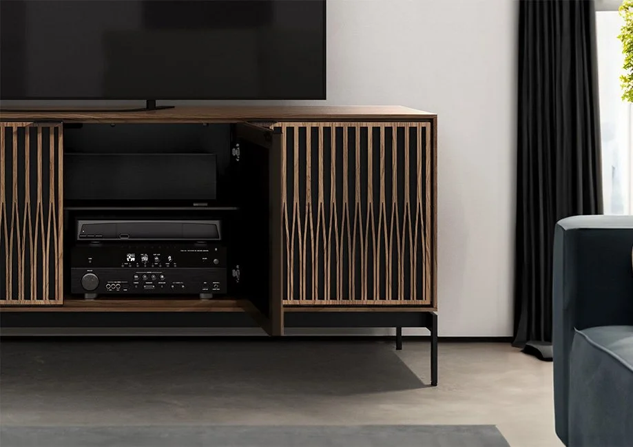 Explore the award-winning media cabinet! With a unique door pattern, base designs, and finishes, you can create the perfect fit for your space. Choose from sideboards with 2 or 3 wooden doors, clear glass shelves, and lacquered wood panels. Add a touch of elegance with an optional clear glass top and mirrored drawers. Every detail, from acoustic transparency to precision-engineered hinges, is designed to impress both inside and out.
